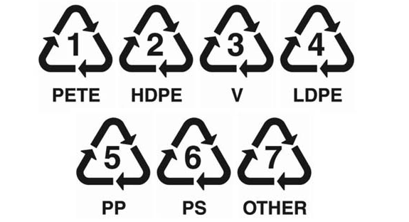PET1: Polyethylene Terephthalate: marked with a 1 on the triangle. Very commonly recycled, can break down when exposed for long periods of time to light or heat.